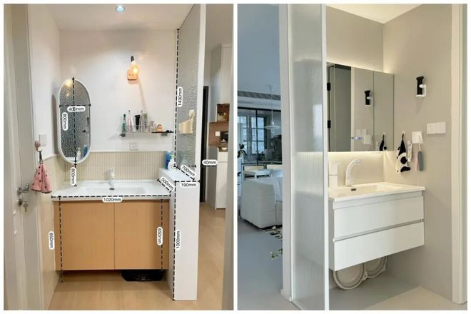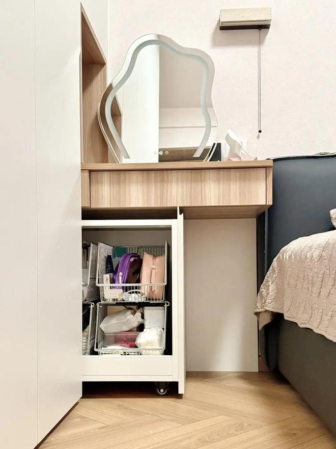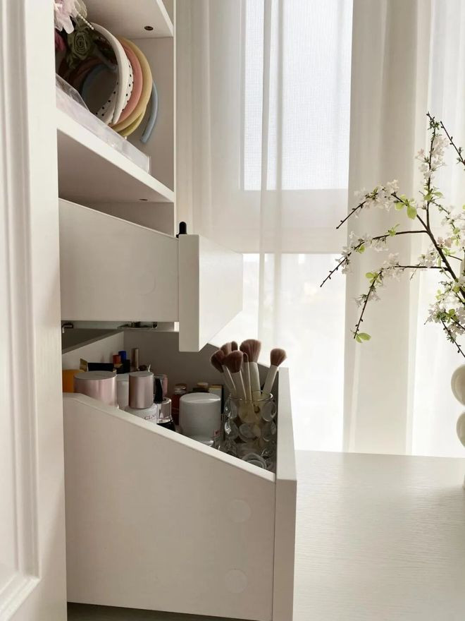 需要注意的是,抽屉需要做「内高外低结构」,即便坐着也能一眼看到里面的小件化妆品,免去伸头翻找的麻烦。