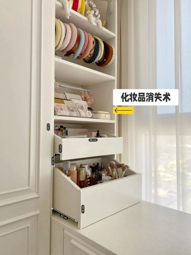 所以,最实用的做法,还是将两边的开放格做成抽屉,利用抽屉隐藏隐形化妆品,既整洁又好用。