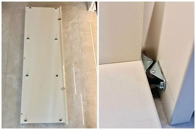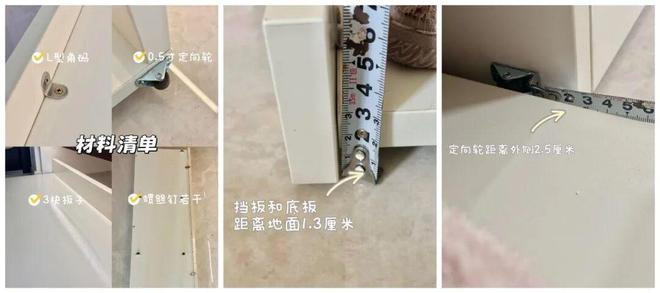 1)用L型角码拼装拖盘,底板和挡板距离地面1.3cm,底板宽度要比鞋柜开放格短2.6cm,预留出定向轮空间。