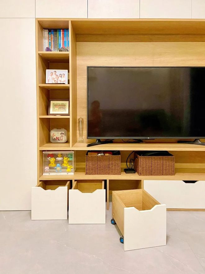 电视墙做了满墙柜家庭,可以做「无底板+抽拉柜」设计,有了娃之后,才会知道有多实用。