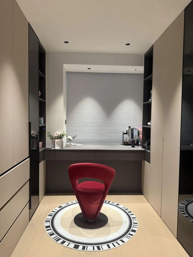 不少人都会在衣帽间里临窗设计一张梳妆台,再搭配上两边的开放格,看起来收纳和台面都有了。