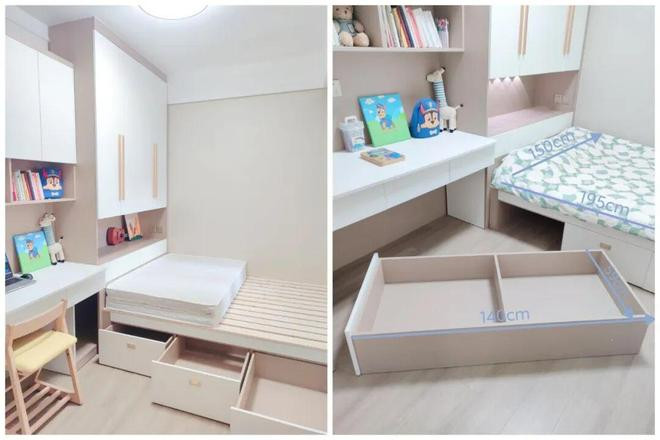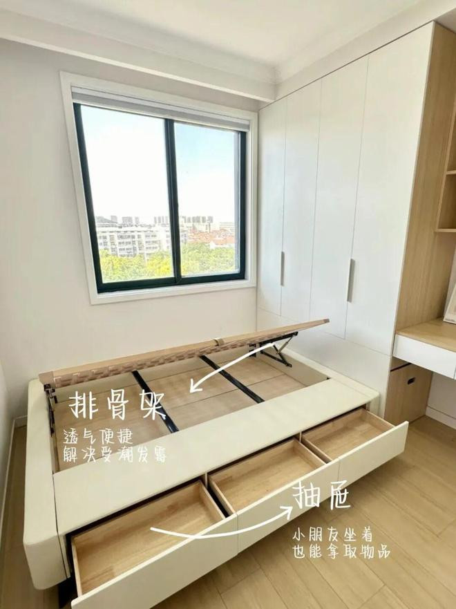 也就是床板用排骨架代替,保证通风;侧面3个抽屉做超深设计,解决收纳不好用的问题。
