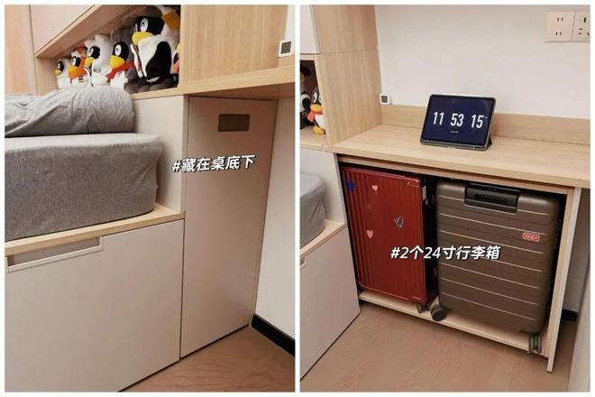 另外,榻榻米床头柜底部空间,也记得做成「抽拉式柜体」,用来放行李箱再合适不过了。