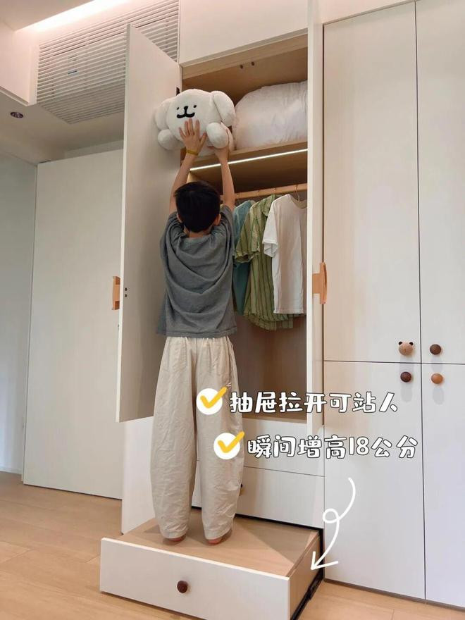 另外,像儿童房的衣柜,还可以在衣柜底部设计一个「抽屉凳」,方便拿取高处衣物,且不影响收纳。