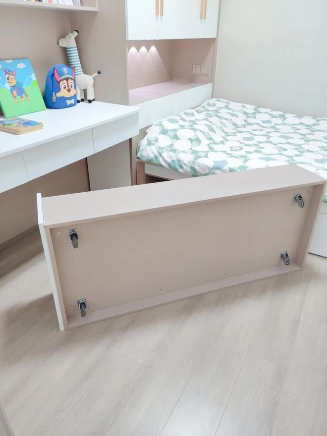 如果房间太小,超长抽屉拉不出来,就给排骨架做「液压上掀式」结构,收纳更轻松一些。