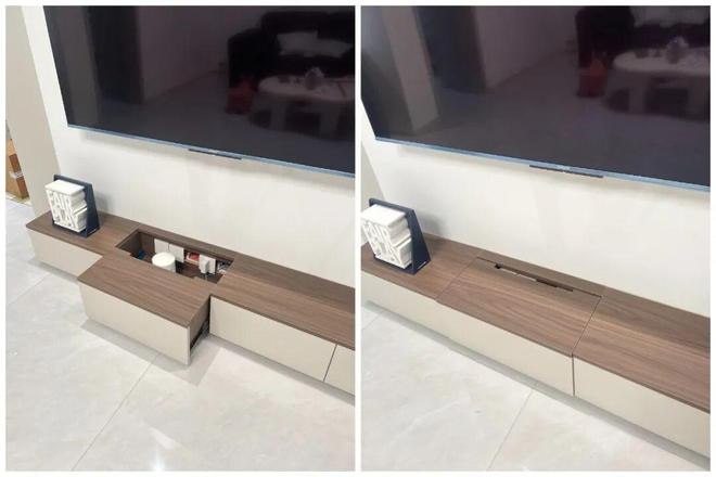 如果只准备做地柜,那就将电视柜中间设计一个「抽拉台面」,方便插拔插头,免去弯腰趴地才能操作的痛苦。