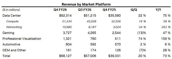 具体到核心业务线,若从2026财年全年看,英伟达的数据中心业务贡献了1934.8亿美元的营收,同比增长68%,是利润支柱。