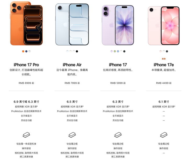 iPhone 17e提供256GB和512GB两个版本,售价分别为4499元和6499元。感兴趣的小伙伴可于3月4日晚去苹果官方渠道预购。